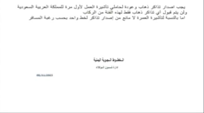 أصدرت شركة الخطوط الجوية اليمنية، السبت، تنبيهًا هامًا للمسافرين إلى المملكة العربية السعودية، وخاصةً لمن يحملون تأشيرة عمل لأول مرة، مؤكدة أنه ابتداءً من السبت ٨ نوفمبر لن يتم قبول إصدار تذكرة باتجاه واحد فقط، ويجب حجز تذكرة (ذهاب وعودة) معًا كشرط أساسي لإتمام الحجز والدخول. وأوضحت الشركة أن هذا الإجراء يقتصر فقط على حملة تأشيرات العمل المستخرجة لأول مرة، ولا يشمل تأشيرات العمرة، حيث ما يزال بإمكان المعتمرين الحجز باتجاه واحد دون أي منع أو تغيير، وفق رغبة المسافر وجدول سفره.