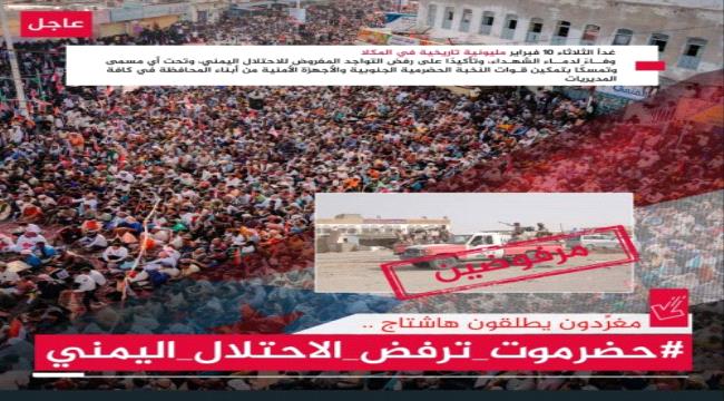 أطلق مغردون جنوبيون، اليوم الاثنين، هاشتاج #حضرموت_ترفض_الاحتلال_اليمني، تزامنا مع حملة قمع واعتقالات تعسفية تطال متظاهرين سلميين شاركوا في مسيرة جماهيرية قبل 3 أيام في سيئون.
